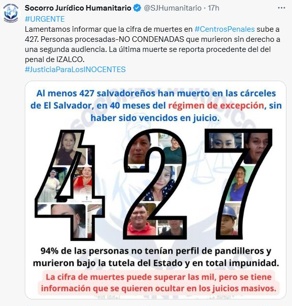 El perfil de las víctimas contradice la narrativa oficial de que se trata únicamente de pandilleros. Según organizaciones civiles, el 94 por ciento de los fallecidos no tenía vínculos con estructuras criminales y permanecía en detención provisional.