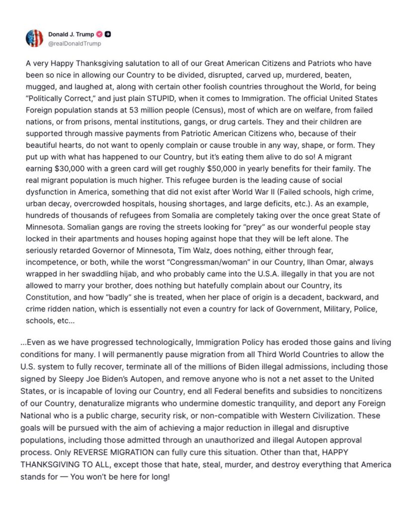 Trump afirmó en su mensaje de Acción de Gracias que impulsará una “pausa permanente” de la migración desde todos los “países del Tercer Mundo”, sin precisar qué naciones abarca ni cómo se implementará legalmente. También prometió revisar y revertir “millones” de admisiones aprobadas bajo el gobierno de Joe Biden, eliminar ayudas y subsidios federales para no ciudadanos y expulsar a quienes considere que no son un “activo neto” para Estados Unidos.