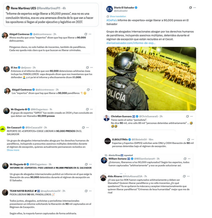 En paralelo a la respuesta institucional, distintos voceros y cuentas afines al oficialismo emprendieron una campaña en redes sociales para desacreditar el informe. En mensajes virales, aseguran que el reporte exige la liberación de más de 90,000 prisioneros, equiparando sus recomendaciones con una amnistía general para los detenidos. Sin embargo, el documento no plantea en ningún momento la excarcelación automática de la población penitenciaria, sino la revisión de casos sin pruebas y la investigación de abusos, lo que evidencia una distorsión deliberada de su contenido.
